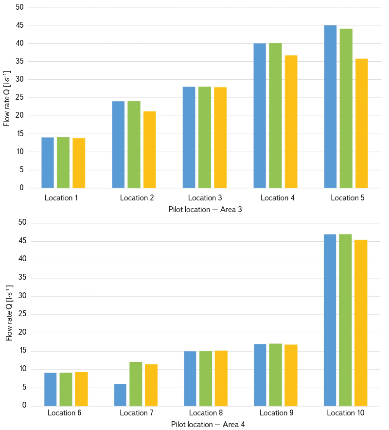 Fig. 2. Comparison of the MRF according to the draft Regulation of the Government in the 2019 version (yellow column), the MRF according to the Methodical Instruction from 1998 (green column) and the MRF determined in the water management permit (blue column) for selected locations in Area 3 and Area 4