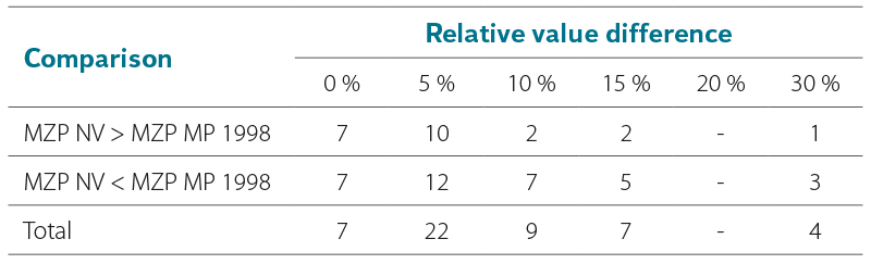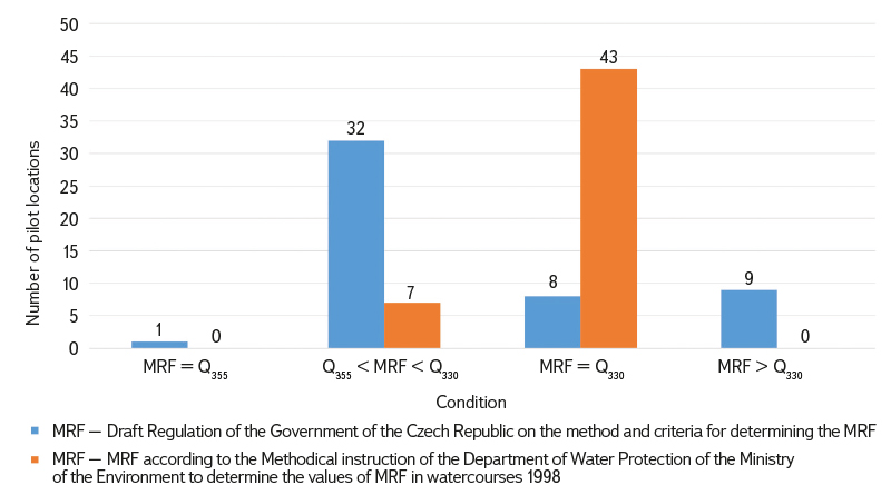 Tab. 1. Comparison of the method of determining the minimum residual flow (MRF) according to the draft Regulation of the Government of the Czech Republic on the method and criteria for determining the MRF in the 2019 version (MZP NV) and according to the Methodical Instruction of the Department of Water Protection of the Ministry of the Environment to Determine the Values of MRF in Watercourses from 1998 (MZP MP 1998) shown as their percentage difference