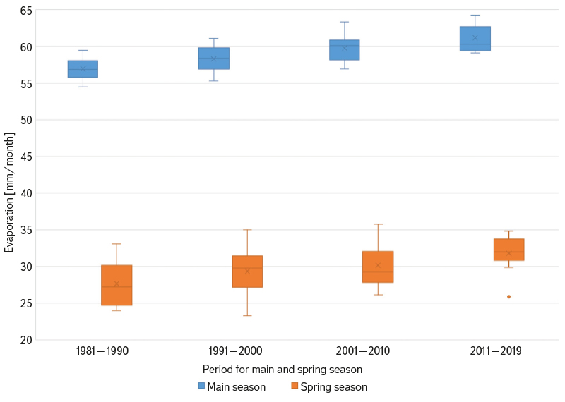 Fig. 4.  Example of average decadal evaporation for the main season and for the secondary spring season for one pilot site