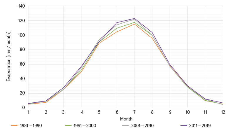 The project also focused on assessing the relevance of reducing the prescribed MRF by losses due to evaporation and seepage into the subsoil. Seepage into the subsoil is related to hydrogeological conditions at the HS location. The evaluation of evaporation losses, presented in Figs. 4 and 5, shows an increasing trend over successive decades. However, reducing the MRF by evaporation losses is not acceptable for small reservoirs and ponds, as it would lead to a reduction of the MRF itself.