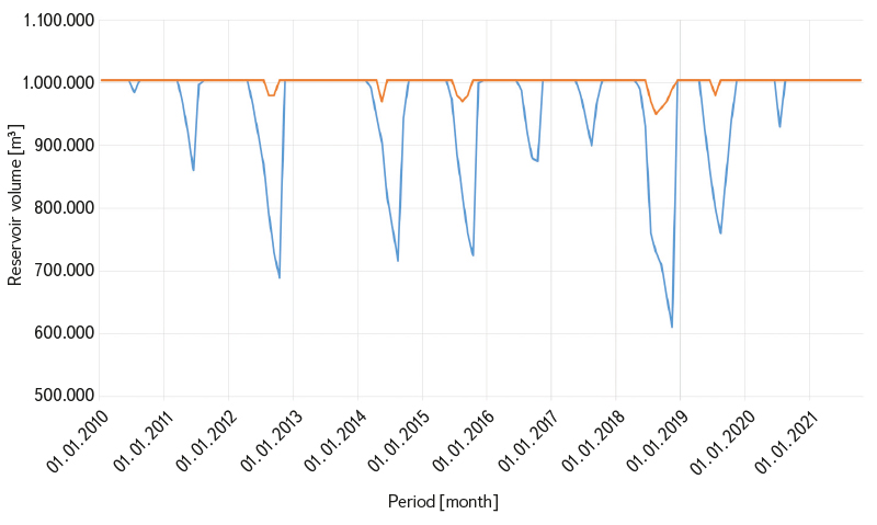 Fig. 6.  Illustration of volume in the reservoir when complying with the MRF (blue curve) and not complying with the MRF (orange curve) at the reservoir outlet for the period from 2010 to 2021