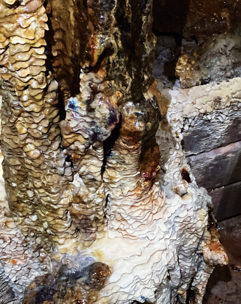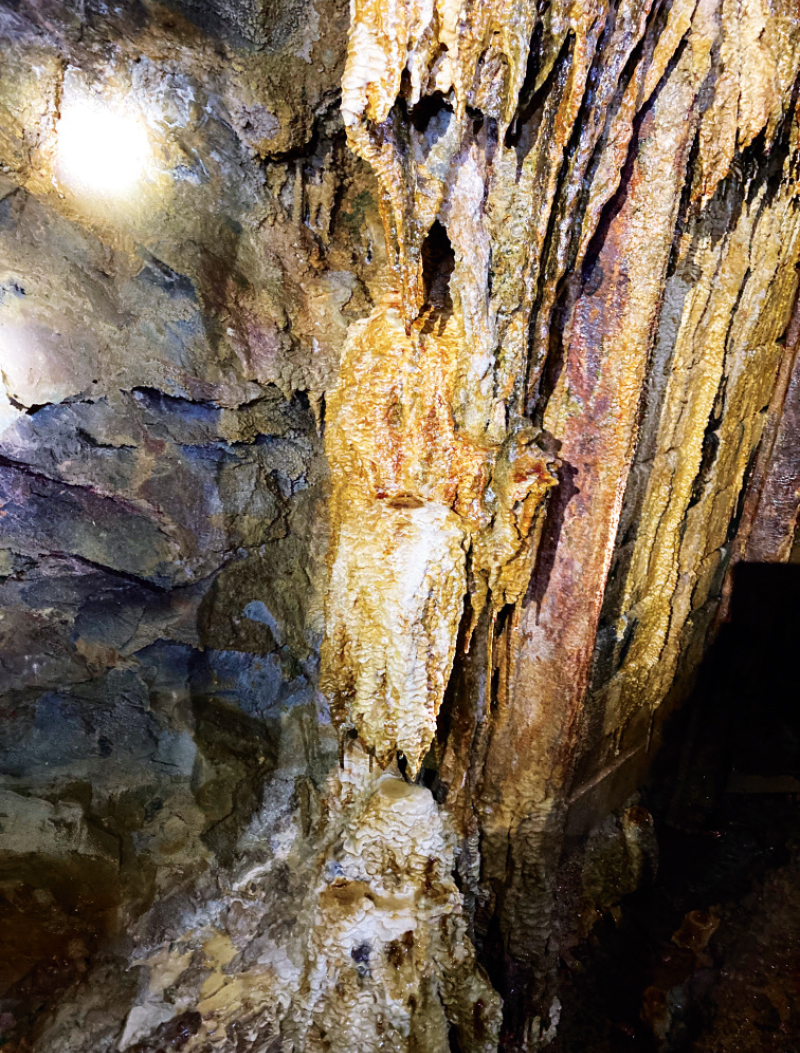 Entering the depths of Svornost Mine – that is, descending to the twelfth level, roughly 500 metres underground – is not entirely impossible for patients or visitors to the Jáchymov spa. Guided tours with expert commentary are occasionally organised. All that is required is sturdy footwear and warm clothing – mine staff then provide a blue protective coat and a helmet with a headlamp – and perhaps a little courage, as visitors voluntarily plunge in a metal cage through darkness and cold, icy water dripping on them, while the hoist wails deafeningly. But it is worth it. Below, only a few technical instructions remain on very wellworn doors (Fig. 9), marking the end of the familiar, civilised world. The tunnels are dark, damp, and cold, and each person is truly on their own here (Fig. 10). Yet, when illuminated by the headlamps on the helmets, the walls seem to come alive, playing with all the colours of a wide variety of ores and minerals – limestone, sulphur, iron, as well as silver, tin, cobalt, and others (Fig. 11). After all, Jáchymov hosts 17 metal-bearing ores and over 400 different minerals. Our guide adds that this makes Svornost Mine the richest geological site in the world. Complex stalactites are also often seen here, thriving in the cold, damp conditions (Fig. 12).