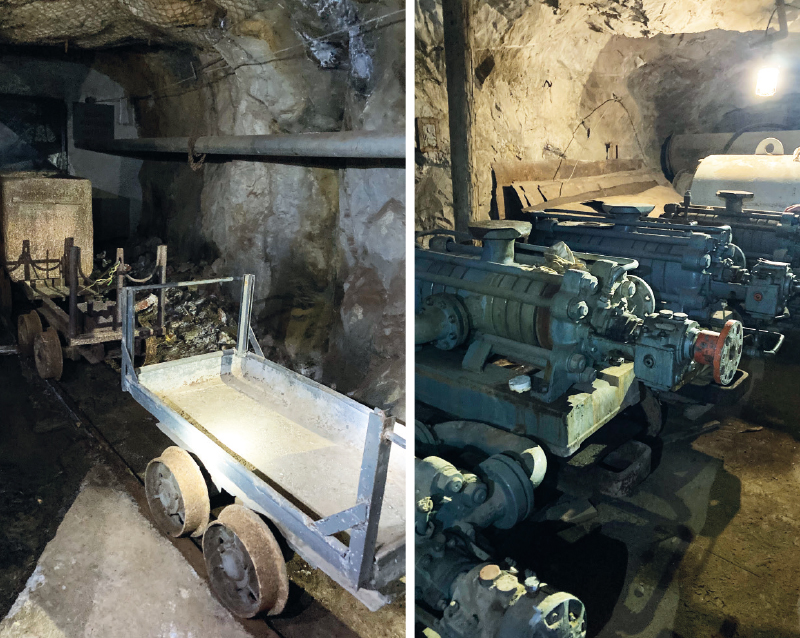 The mine tour continues through more dark tunnels until the guide stops at a large mining installation with a tank and Academician Běhounek Spring (Fig. 14). From this point, the richest of the four springs is distributed to the various spa buildings throughout Jáchymov. In one of the side tunnels, the original mine carts and parts of historic pumps are still on display (Figs. 15a, b).