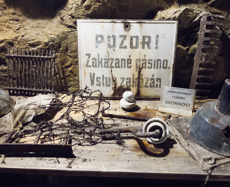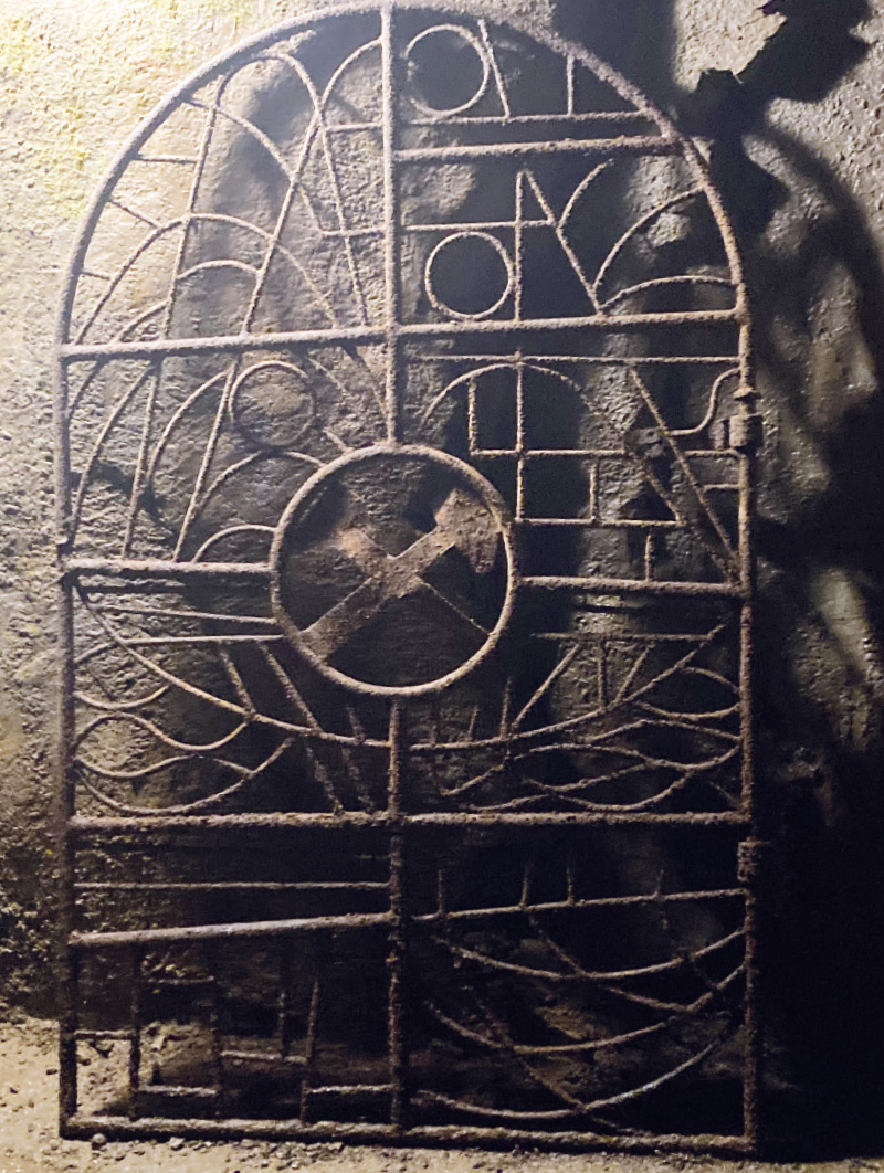 Just about 100 metres from Svornost Mine, in the direction of the centre of Jáchymov, lies Adit No. 1. Although it is near the surface, it is still cool inside. The adit is 260 m long and was driven in 1952 to verify uranium mineralisation. Silver was also mined here, from a silver vein called Jan Evangelista. Unlike Svornost, its tunnels are illuminated, so remnants of the silver vein are still visible on the walls (Fig. 19). Also on display are finds from Svornost and Jáchymov labour camps from the period 1949–1961, that is, from the “harsh” years when tens of thousands of political prisoners, sentenced to long terms, were forced to work in ten local concentration camps (Fig. 20). A reminder of them are the so-called katry (Fig. 21), massive metal grilles used to confine prisoners underground (author’s note: from this term, the Czech expression “sedět za katrem” – to be in prison – later emerged).
