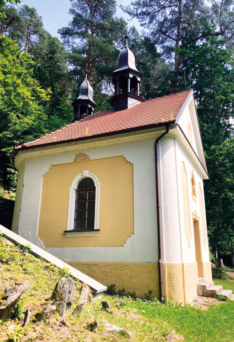 On one of the hills above the spa centre stands the Chapel of Saint Barbara, built in 1777 and also dedicated to the patron saint of all miners (Fig. 26). This chapel is quite unusual, however, as it has two small towers on its roof, symbolising the unity of the local miners and metallurgists in Jáchymov, who together initiated its construction. Another interesting fact is that in 1917 the chapel was moved to the hill above the spa park, including its interior furnishings, because it originally stood in the town centre on the site of today’s Hotel Astoria, where it had begun to obstruct the developing spa facilities.