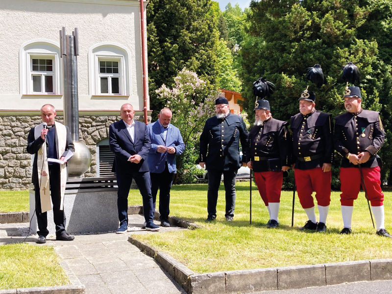 Even a hundred years after Marie Curie’s visit to Jáchymov, it still pays to be in the right place at the right time [see more in 2]. For instance, visiting Jáchymov Spa in the second half of May this year offered a special opportunity: on Saturday, 24th May, guests could attend the ceremonial opening of the 119th spa season and meet the leadership of the town, the spa, and Svornost mine, including an invitation to the international conference The legacy of Marie Curie in Jáchymov Spa and the 100th anniversary of her visit [3]. The highlight of the day’s festivities was the blessing of the springs and wishes for a successful spa season delivered by Father Milan Geiger, followed by speeches from František Holý, the Mayor of Jáchymov, Gustav Žaludek, Director of the Spa, and Martin Přibil, Director of Svornost Mine. The ceremony also featured mine workers in traditional uniforms (Fig. 4). Svornost Mine – one of Jáchymov’s defining landmarks and enduring symbols – is, in many