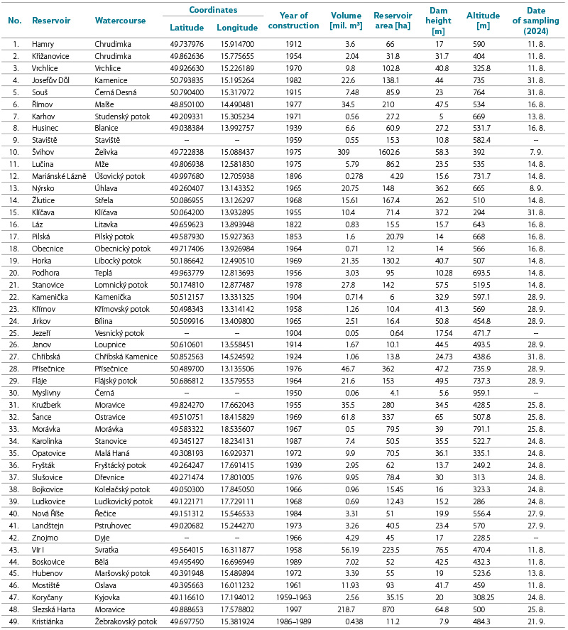 Tab. 1. List and characteristics of water reservoirs (in order according to Decree No. 137/1999 Coll. [1]) and date of water mites sampling in 2024