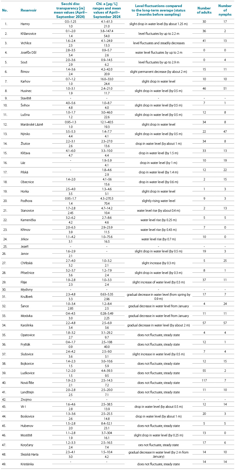Tab. 2 contains data on chlorophyll a concentrations in the individual reservoirs, which allow comparison of their trophy, as the quantity of phytoplankton is an indicator of nutrient loading in water bodies. Mean values and ranges of chlorophyll a concentrations are presented, based on samples collected at weekly intervals from April to September 2024. Typically, 9 to 11 values were determined over the course of the season. Tab. 2 includes data on water transparency, also measured at weekly intervals during the period from April to September. These data were provided by staff of the River Boards, state enterprises from ongoing long-term monitoring of water quality in all water reservoirs.