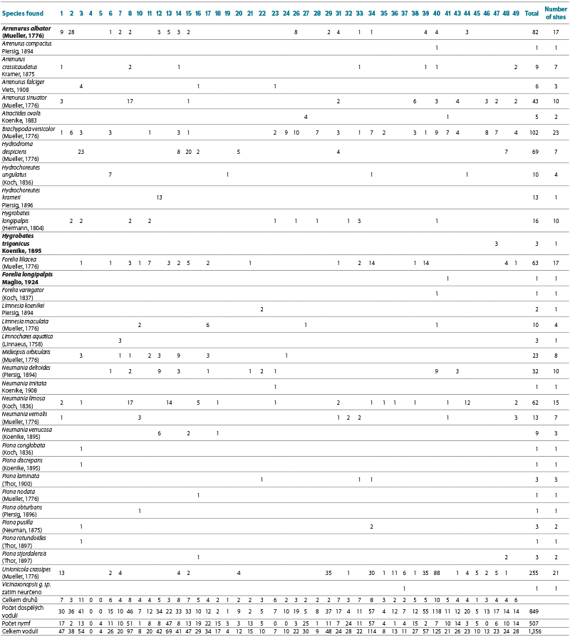 A total of 1,356 water mites were recorded in 45 water reservoirs, of which 507 specimens (37.3 %) were immature stages (nymphs), for which identification to species level is uncertain (Tab. 3). The list of water mite species in Tab. 3 is therefore based solely on the identification of 849 adult individuals, whose occurrence and abundance were found at the individual sites.