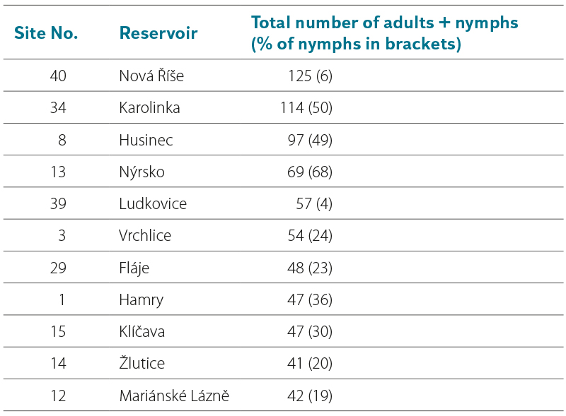 The abundance of water mites in individual drinking water reservoirs shows considerable variation (Tab. 3), with the highest numbers recorded in Nová Říše reservoir (site No. 40; see Fig. 9) and Vrchlice reservoir (site No. 3). This may be due to the short distance of the sampling sites from macrophyte stands in the littoral zones of both reservoirs, as aquatic vegetation provides a range of favourable conditions for water mite communities, as evidenced by data in [22, 30, 32]. In Josefův Důl reservoir (site No. 4), no water mites were recorded, while in Souš reservoir (site No. 5) only four nymphs were found (one of which could be identified as a representative of the genus Hydrochoreutes Koch, 1837). The reason is evidently the low pH of water in these reservoirs, which fluctuates considerably over the course of the year: outside the summer season, values drop to around 5.0–5.5, whereas in summer they reach 6.0–7.0, as documented by long-term water quality monitoring carried out by the Elbe River Board, state enterprise. The effect of low pH values on the absence of water mites was also described, for example, by Lundblad [10] in Swedish lakes.