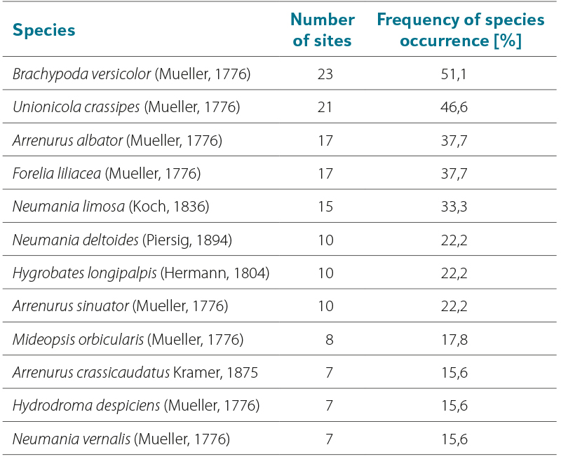 It is evident that not only the character of the habitat, but also the methods used for collecting water mites, have a significant influence on both the occurrence and abundance of individual species. In this study, the occurrence of individual water mite species is compared with published data without assessing the effect of the methods used, which differ considerably – from passive “traps” to quantitative sampling per unit area of the bottom (using corers, grabs, or dredges). The comparisons presented therefore rely on data on the most frequent occurrence of individual species in the littoral zones of different sites.