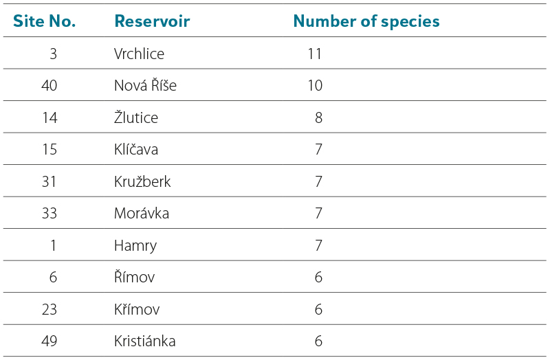 Tab. 6. Reservoirs with the highest number of water mite species