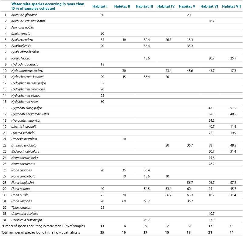 Of the 34 water mite species recorded in the studied water-supply reservoirs, 12 species occurred at more than 10 % of sites (Tab. 5). These are species characterised by pronounced locomotory activity in the pelagic zone.