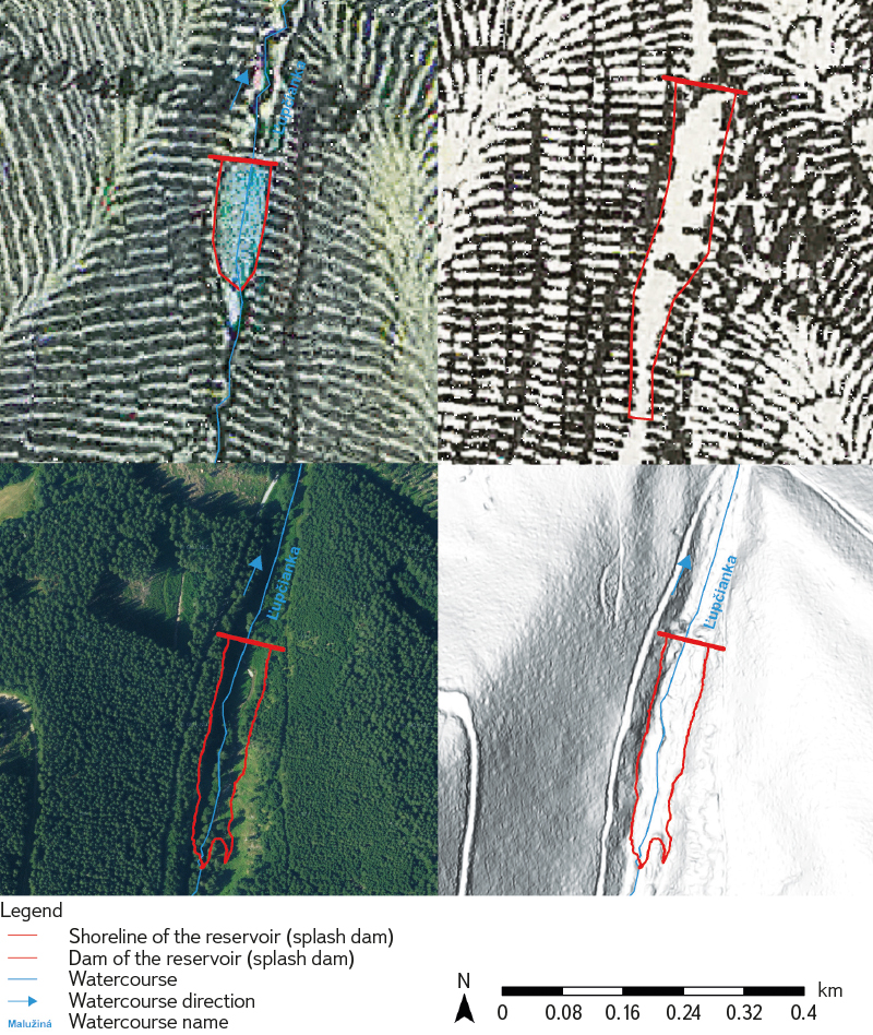 As a supplementary source for the identification of disappeared splash dams, or their relics, a historical orthophotomap from the mid-20th century was used, providing information on an intermediate stage in landscape development. This orthophotomap is freely available on the portal of the Technical University in Zvolen [4].