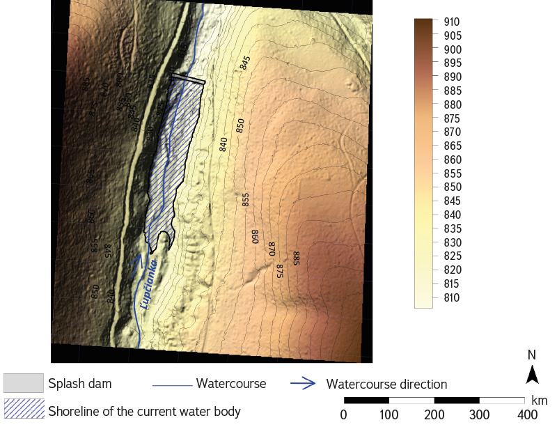 During field measurements, the precise mathematical position of the geometric centre of the dam crest of the Magurka splash dam was determined at 48º 97′ N latitude and 19º 42′ E longitude. The elevation of the crest is 817.5 m a.s.l. The catchment area of the outlet profile of the splash dam, from which water was accumulated in the reservoir, is 1,452.58 ha, representing 18 % of the total catchment area of the Ľupčianka stream.