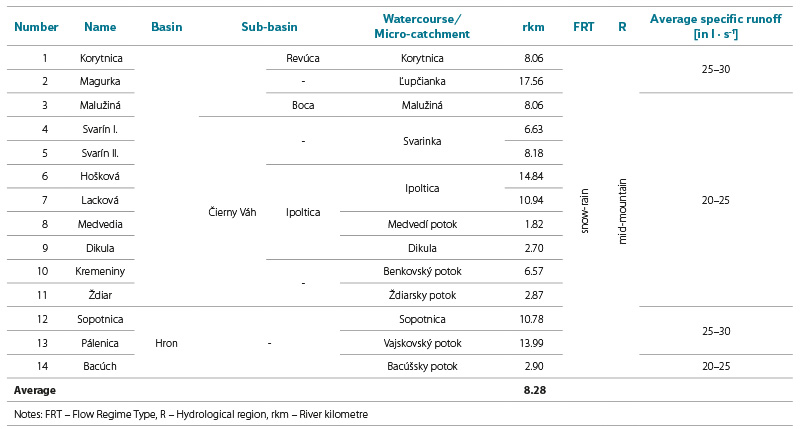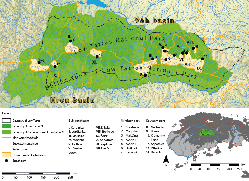 The hydrological conditions of the area are determined by the mountainous character of the relief, with a predominance of short watercourses exhibiting pronounced seasonal discharge dynamics. Splash dams were constructed on smaller streams, where they enabled the regulation of flows and their short-term increase during periods of timber floating. The Low Tatras belong to two main second-order catchments; the Hron and the Váh. Within the Hron catchment, splash dams occur in the valleys of Vajsková (Pálenica), Sopotnica, and Bacúch, while those belonging to the Váh catchment are located in the northern valleys of Korytnica, Ľupčianka, Malužiná, Svarinka, Ipoltica, Medvedia, Dikula, Benkovo, and Ždiar. Splash dams in the Váh catchment belong to the sub-catchments of Revúca, Boca and Ipoltica, which are left-bank tributaries of the Čierny Váh. Splash dams in the Hron catchment are situated on its right-bank tributaries. From a hydrological perspective, the area represents a mid-mountain region with a snow–rain runoff regime characterised by pronounced seasonal variability (Tab. 2) [19, 23].