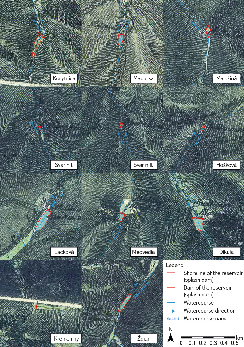 Based on the content analysis of historical maps, with particular emphasis on the 2nd Military Mapping from the second half of the 19th century, and on archival sources, a total of 14 splash dams were identified in the area of the Low Tatras, in most cases preserved only as dam relics. However, it is highly probable that in the past (since the 16th century), additional small water reservoirs were constructed in the headwaters of Low Tatras streams, which had already disappeared by the mid-19th century. This assumption is suggested by limited textual archival sources; however, these wooden, partly earth-built dams are now in such an advanced stage of naturalisation that their location in the field will most likely be impossible. The confirmation or refutation of these hypotheses will require more detailed historical-geographical research (partly making use of the methodology presented here).