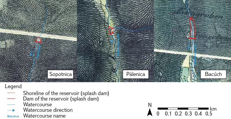 Fourteen splash dams were identified on historical maps. Their total historical area was 6.28 ha (2nd Military Mapping), of which only a small part has been preserved to this day, with an area of 2.19 ha (ZBGIS – current mapping). The results point to a significant decline in historical water areas, with some splash dams disappearing as a result of dam damage, sedimentation, succession, or land use changes, while others have been preserved only in the form of dam relics or have been transformed into new retention reservoirs. The article emphasizes the importance of historical splash dams not only from the perspective of historical-geographical research, but also in the context of current adaptation measures to climate change in mountainous regions.