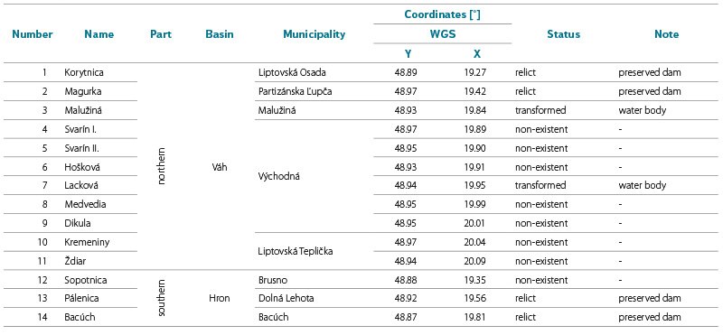 According to their state of preservation, the individual splash dams were categorised (Tab. 4) as preserved (Malužiná, Lacková), partially preserved – relics (Korytnica, Magurka, Svarín I, Svarín II, Hošková, Medvedia, Dikula, Ždiar, Sopotnica, Pálenica, Bacúch), and disappeared (Kremeniny). The individual dams, or their relics, can also be classified according to construction technique into concrete–stone (Bacúch, Magurka), stone (Korytnica), stone–earth (Pálenica, Sopotnica, Medvedia, Dikula), embankment–earth, or rather stone–earth (Malužiná, Lacková, Hošková, Ždiar), and wooden (probably Svarín I, Svarín II and Kremeniny).