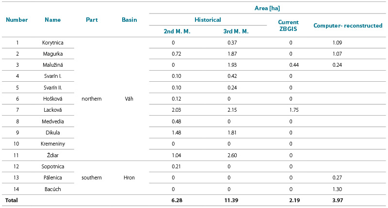 The results of our research show that as many as 85.7 % of splash dams in the area of the Low Tatras have disappeared or have been preserved only in the form of relics, while the current surface area of water reservoirs represents less than one fifth of the historical extent recorded at the end of the 19th century.